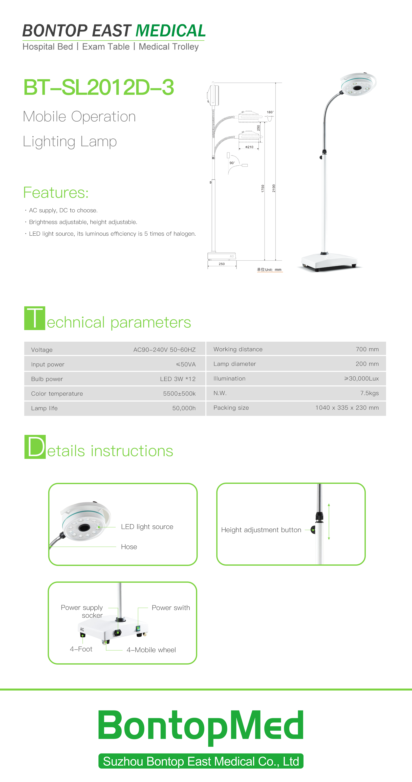 3. LE D lamp source. 200m m lamp panel. Handle operation. Products designed for general outpatient, oral, gynecological, medical cosmetology, pet medical examination. Application areas: outpatient; oral cavity; gynecology; micro plastic surgery; pet medical treatment